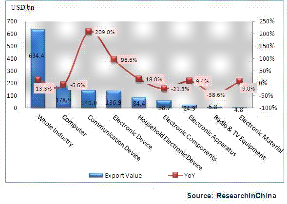 Export Value and YoY of China¡¯s Electronic Information Products by Industry, Jan. ¨C Oct., 2013
