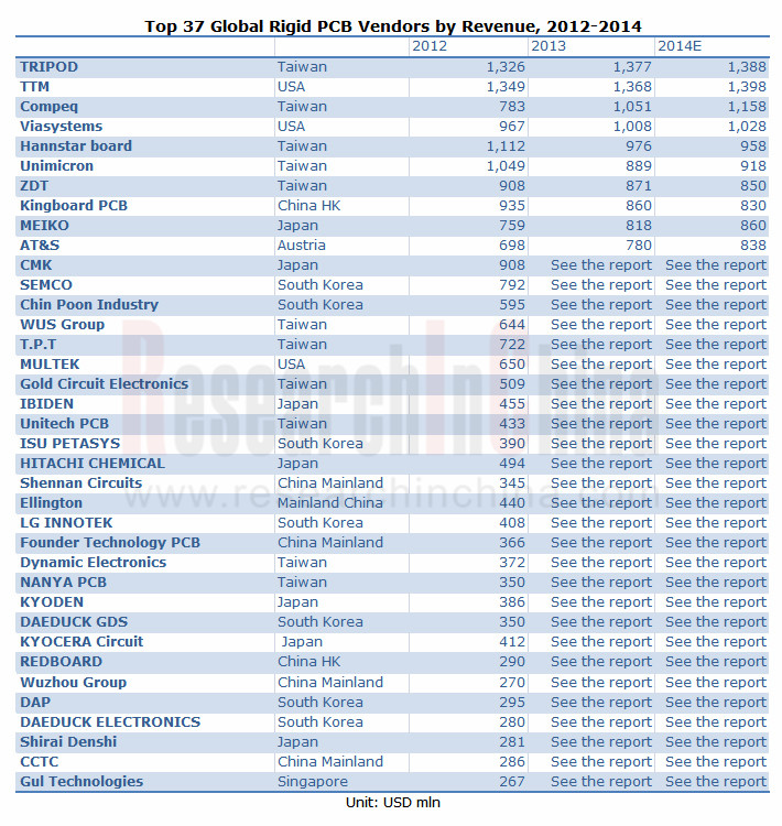 Top 37 Global Rigid PCB Vendors by Revenue, 2012-2014