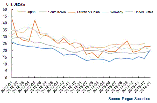 Average Import Price of Polycrystalline Silicon in China, 2012-2014