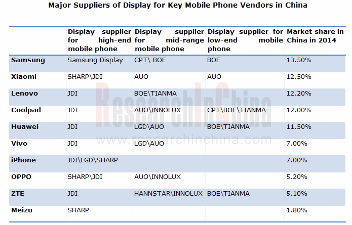 Major Display Suppliers for Key Mobile Phone Vendors in China